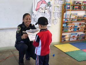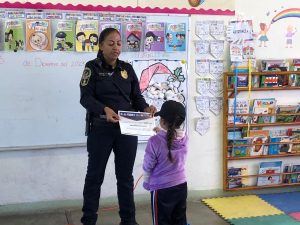 Chihuahua, Chih. A 17 de diciembre de 2023.- Para concluir de manera simbólica el primer periodo de enseñanza contra las adicciones y la violencia en escuelas de nivel básico de la ciudad, agentes del grupo DARE de la Dirección de Seguridad Pública Municipal, efectuaron la entrega de reconocimientos a niñas y niñas del kínder “Octavio Paz”.
