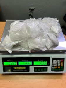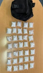 Al ser abordado, los oficiales le aseguraron una bolsa que portaba consigo, en la cual trasladaba por lo menos 34 envoltorios de lo que se presume son narcóticos, equivalentes a al menos 820 gramos de una sustancia con las características propias del cristal.