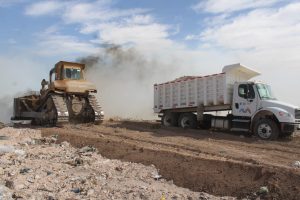Personal de la Dirección de Servicios Públicos Municipales del Gobierno Municipal en conjunto con el H. Cuerpo de Bomberos, intervienen para controlar el incendio que se presentó la mañana de este domingo 24 de marzo en la celda dos del relleno sanitario.