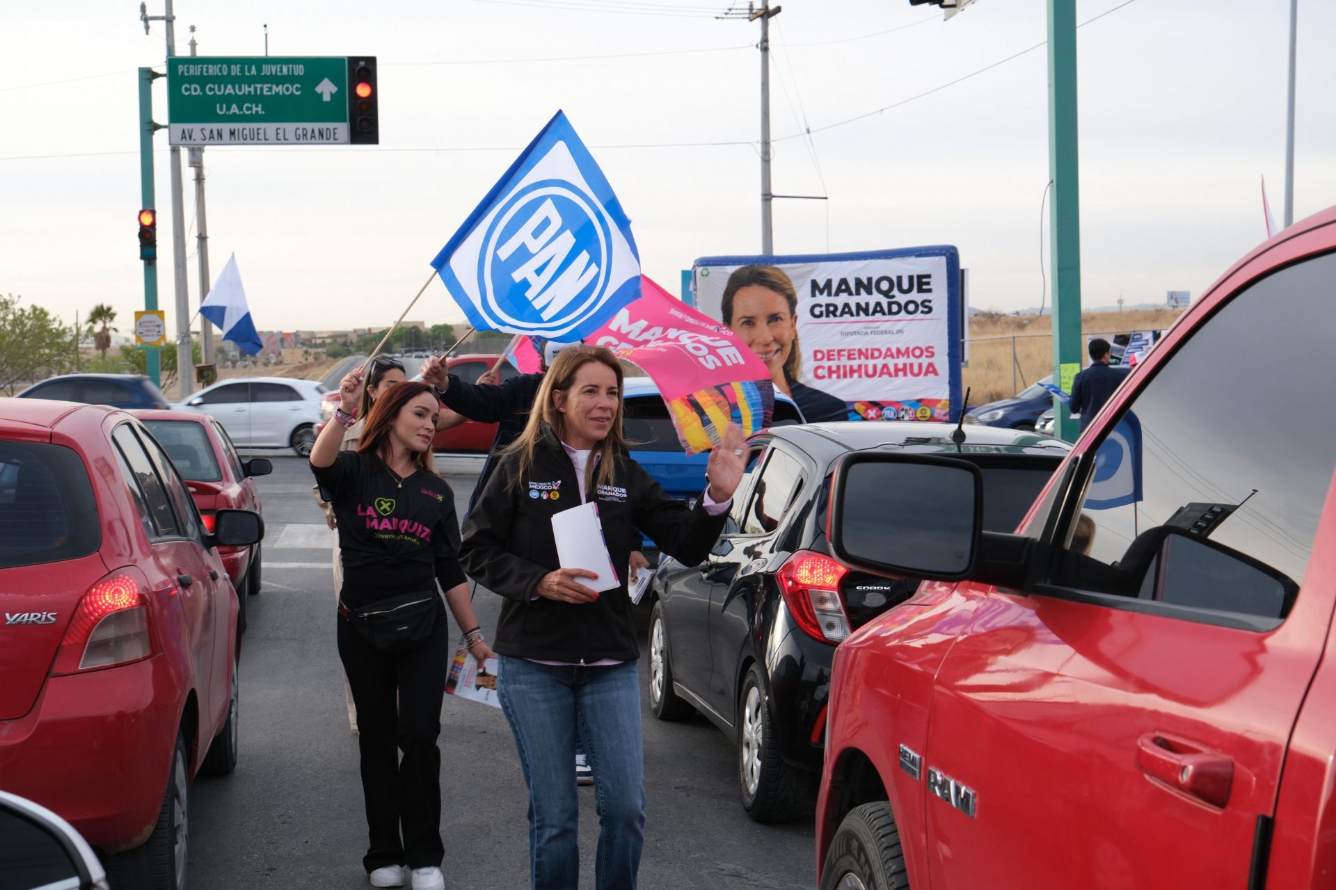 En dicho cruce de avenidas Manque Granados, invitó a los chihuahuenses a votar por los candidatos de la coalición Fuerza y Corazón por México, encabezados a nivel nacional por la candidata presidencial Xóchitl Gálvez, así como por Mario Vázquez y Daniela Álvarez, candidatos al Senado de la República.