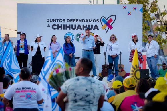 Marco Bonilla, candidato a presidente municipal por la coalición «Juntos Defendamos a Chihuahua», acudió al cierre de campaña de Nancy «La China» Frías, candidata a diputada local por el distrito 12, para juntos ratificar el compromiso de trabajar por Chihuahua frente a las elecciones del 2 de junio.