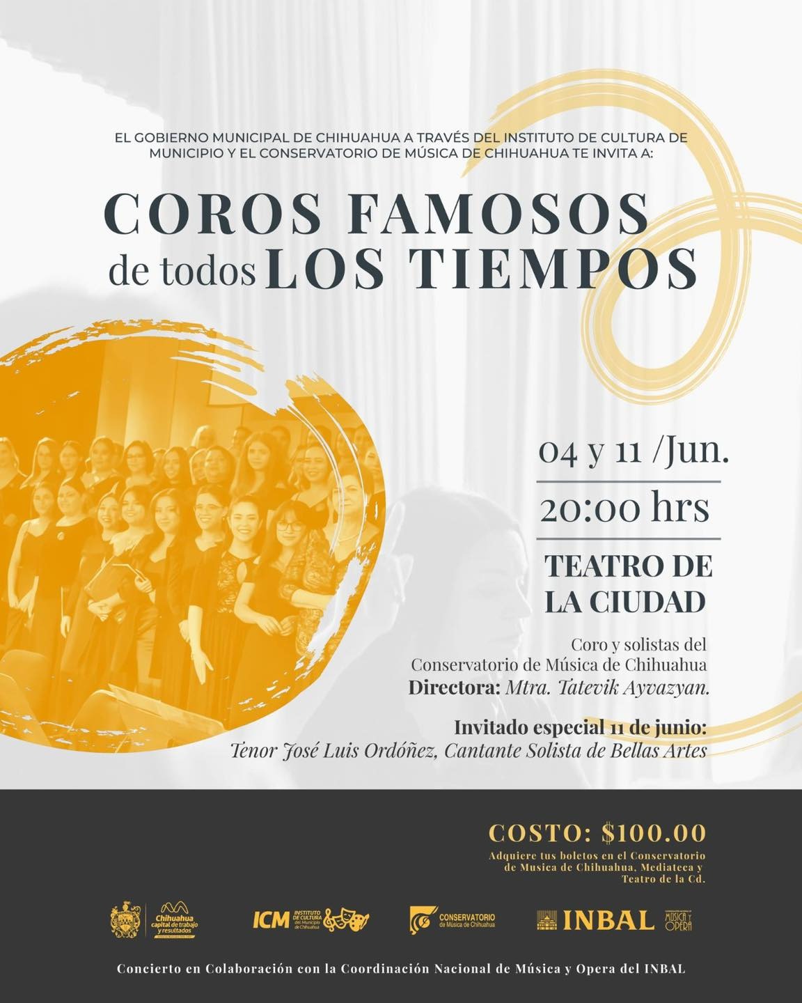 H. Ciudad de Chihuahua, Chih., a 8 de junio del 2025.- El Gobierno Municipal, a través del Instituto de Cultura y el Conservatorio de Música, invitan al concierto “Coros famosos de todos los tiempos”, que se realizará en el Teatro de la Ciudad, este miércoles 11 de junio, a las 8:00 pm.