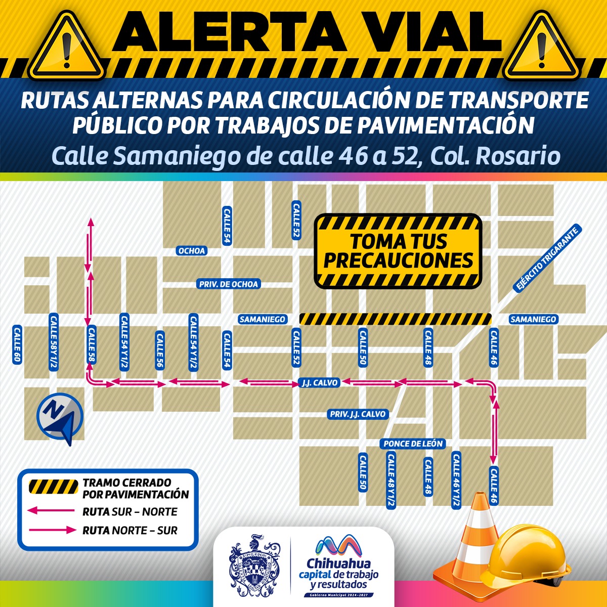 El tramo en que se intervendrá es de la calle 46 a la 52 de la colonia Rosario, por lo que la circulación vehicular alterna en la zona se podrá realizar por las calles Ochoa y J.J. Calvo, mientras que la ruta de transporte público que normalmente transita por la calle Samaniego sufrirá un desvió hacia la calle J.J. Calvo.
