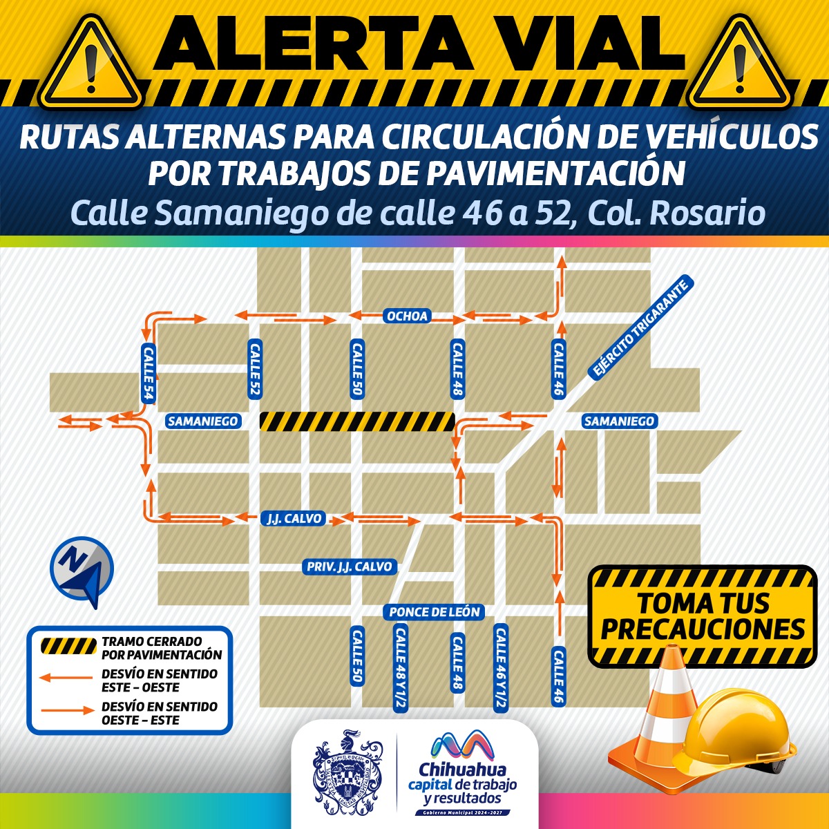 H. Ciudad de Chihuahua, Chih., a 08 de junio del 2025.- El Gobierno Municipal, a través de la Dirección de Obras Públicas, recuerda que mañana inicia la pavimentación en la calle Samaniego, proyecto ganador del Presupuesto Participativo 2025, por lo que se exhorta a la ciudadanía a circular con precaución y tomar rutas alternas ya que durante esta semana habrá un cierre parcial en el sector.