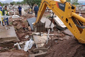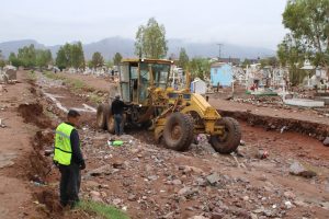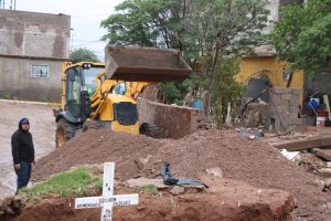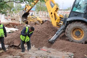 Lo anterior, con maquinaria pesada y cuadrillas manuales, mismas que se encuentran retirando arrastres en las calles aledañas y con el material levantado se está tapando la zona afectada al interior del panteón.