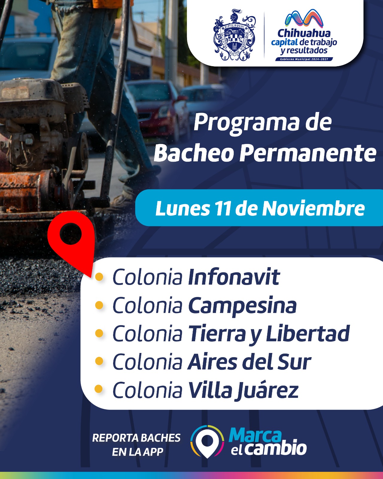 -Recuerda realizar reportes de baches en la aplicación Marca el Cambio y al 072 en el Centro de Respuesta Ciudadana Chihuahua, Chih. A 11 de...